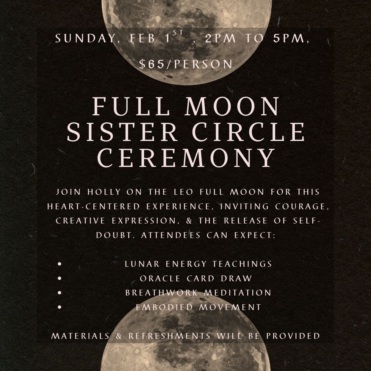Join Holly on the Leo full moon for this heart-centered experience. Inviting courage, creative expression, & the release of self-doubt. Attendees can expect Lunar Energy Teachings, Oracle Card Draws, Breathwork Meditation, & Embodied Movement. Materials & refreshments will be provided.