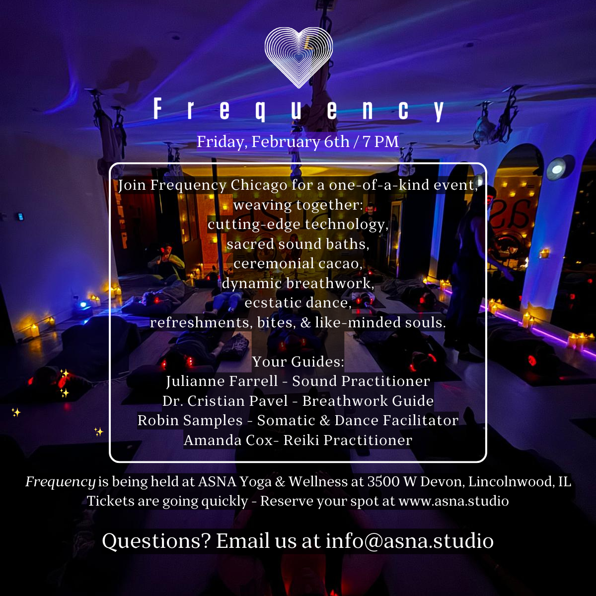 Step into a transformative journey with Frequency Chicago, where ancient wisdom meets modern innovation. This one-of-a-kind event weaves together cutting-edge technology, sacred sound baths, ceremonial cacao, dynamic breathwork, and ecstatic dance to elevate your spirit and awaken collective consciousness.